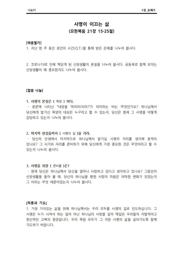 2020년 6월 7일 나눔터(목원용) 가야예배당