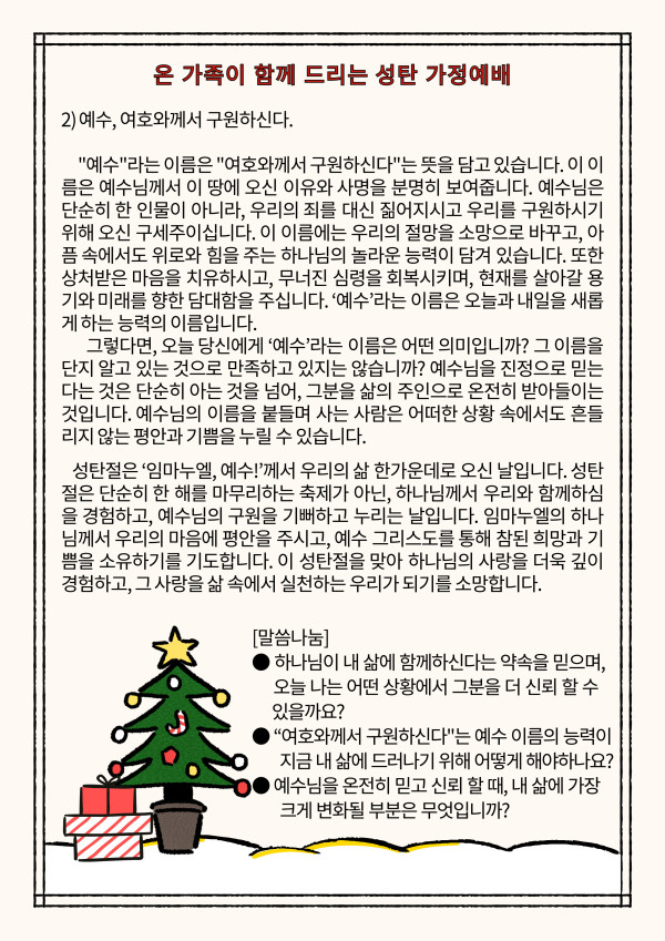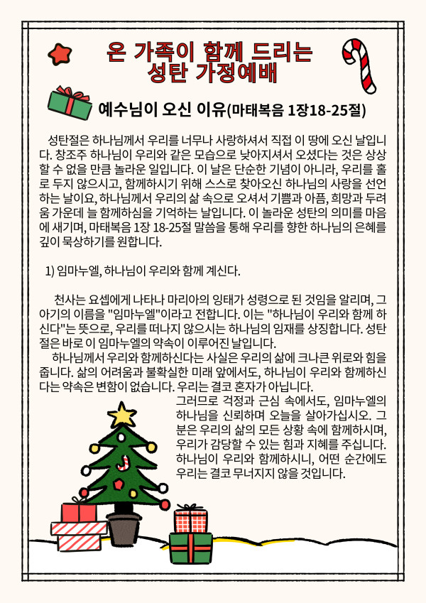 2024년 성탄 가정예배 페이지 정보 작성자 관리지기 작성일24-12-21 11:50 조회5,976회 댓글0건 관련링크 이전글 다음글 목록 본문 2024년 성탄 가정예배 댓글목록 등록된 댓글이 없습니다. 이전글 다음글 목록