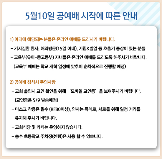 5월 10일(주일) 부터 교회 예배당에서 공예배를 시작합니다 [안내사항]