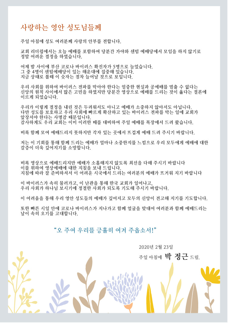 박정근 담임목사가 영안교회 성도님께 드리는글