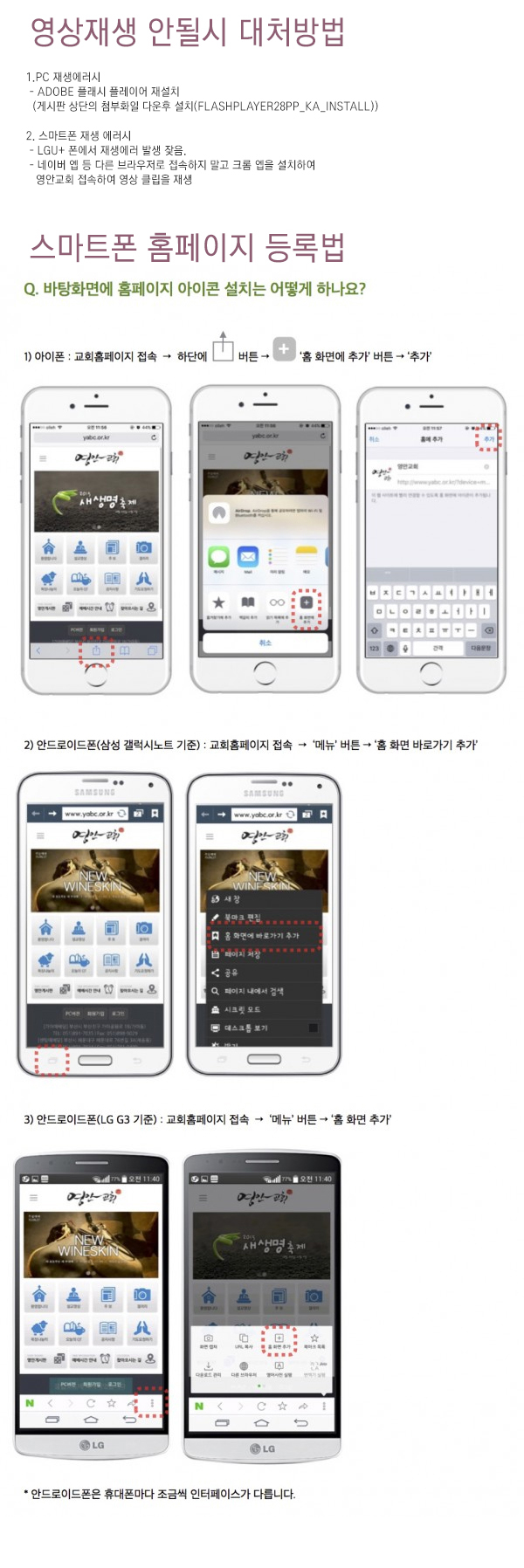 일부 안드로이드 기반 휴대폰에서는 작동법이 조금씩 다를 수 있습니다. ^^