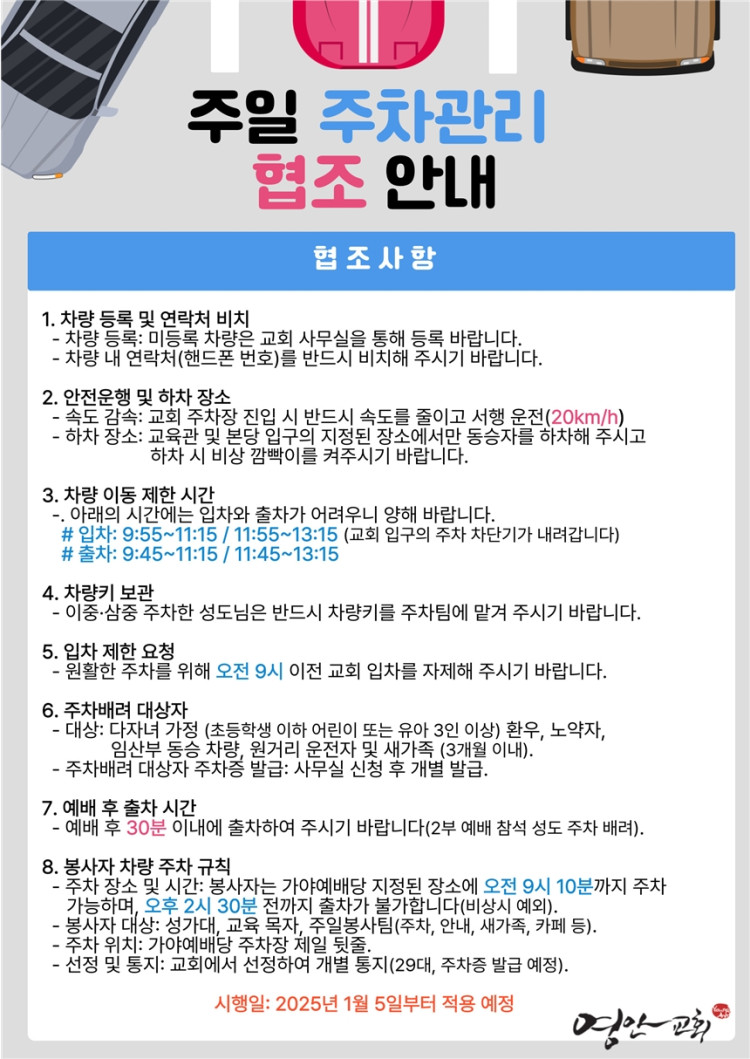 2025 주일 주차관리 협조 안내 (가야예배당) 페이지 정보 작성자 관리지기 작성일24-12-21 14:24 조회2,636회 댓글0건 관련링크 목록 본문 ◆ 2025 주일 주차관리 협조 안내 (가야예배당) 댓글목록 등록된 댓글이 없습니다. 목록