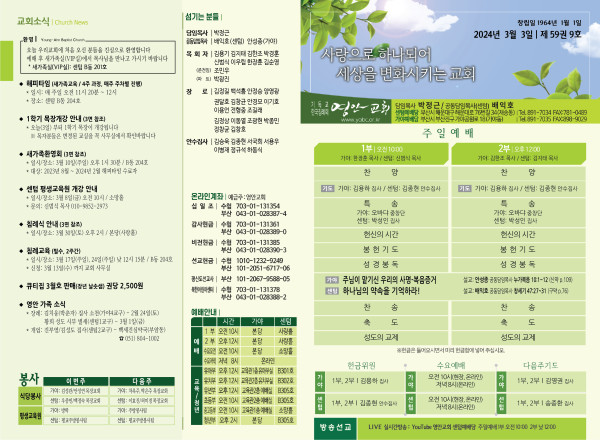 2024년 3월 3일 주보 (센텀예배당) 페이지 정보 작성자 관리지기 작성일24-03-02 11:57 조회2,876회 댓글0건 관련링크 목록 본문 2024년 3월 3일 주보 (센텀예배당) 댓글목록 등록된 댓글이 없습니다. 목록