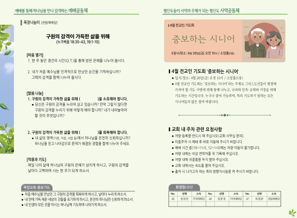 2024년 4월 21일 주보 (센텀예배당) 페이지 정보 작성자 관리지기 작성일24-04-20 10:38 조회2,708회 댓글0건 관련링크 목록 본문 2024년 4월 21일 주보 (센텀예배당) 댓글목록 등록된 댓글이 없습니다. 목록
