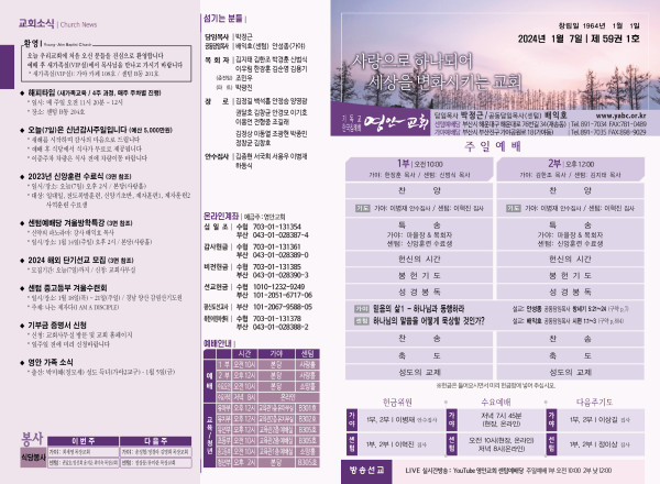 2024년 1월 7일 주보 (센텀예배당) 페이지 정보 작성자 관리지기 작성일24-01-06 10:52 조회3,490회 댓글0건 관련링크 목록 본문 2024년 1월 7일 주보 (센텀예배당) 댓글목록 등록된 댓글이 없습니다. 목록