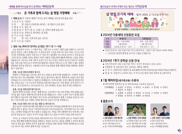 2024년 2월 4일 주보 (센텀예배당) 페이지 정보 작성자 관리지기 작성일24-02-03 11:12 조회3,059회 댓글0건 관련링크 목록 본문 2024년 2월 4일 주보 (센텀예배당) 댓글목록 등록된 댓글이 없습니다. 목록