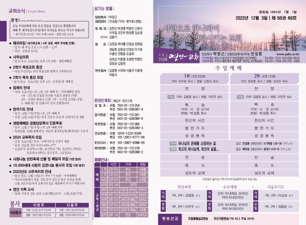 2023년 12월 3일 주보 (가야예배당) 페이지 정보 작성자 관리지기 작성일23-12-02 12:09 조회3,533회 댓글0건 관련링크 목록 본문 * 2023년 12월 3일 주보 (가야예배당) 댓글목록 등록된 댓글이 없습니다. 목록