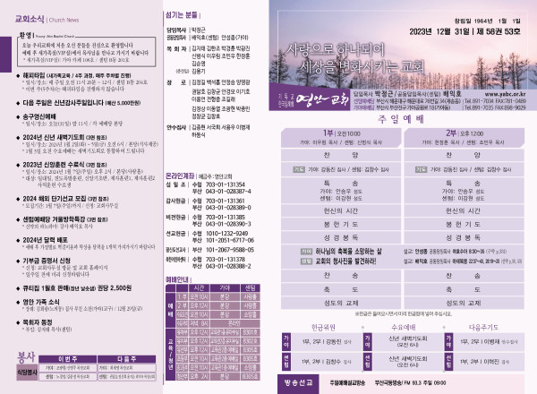 2023년 12월 31일 주보 (센텀예배당) 페이지 정보 작성자 관리지기 작성일23-12-30 11:06 조회3,188회 댓글0건 관련링크 목록 본문 2023년 12월 31일 주보 (센텀예배당) 댓글목록 등록된 댓글이 없습니다. 목록
