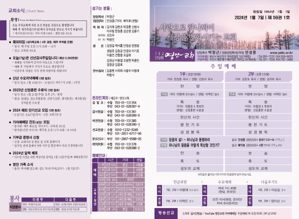 2024년 1월 7일 주보 (가야예배당) 페이지 정보 작성자 관리지기 작성일24-01-06 10:51 조회3,267회 댓글0건 관련링크 목록 본문 2024년 1월 7일 주보 (가야예배당) 댓글목록 등록된 댓글이 없습니다. 목록