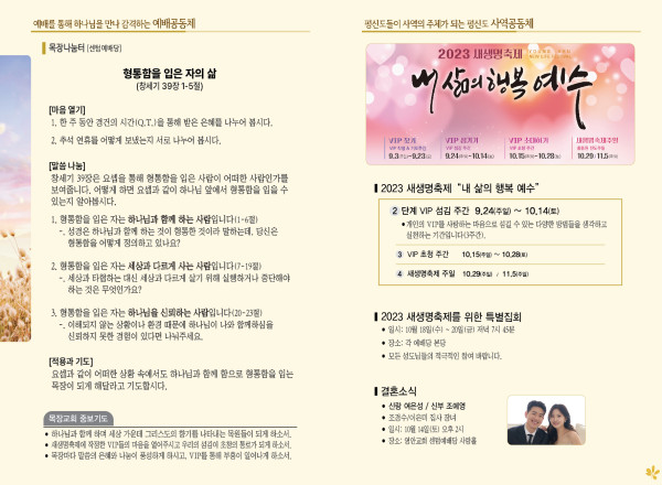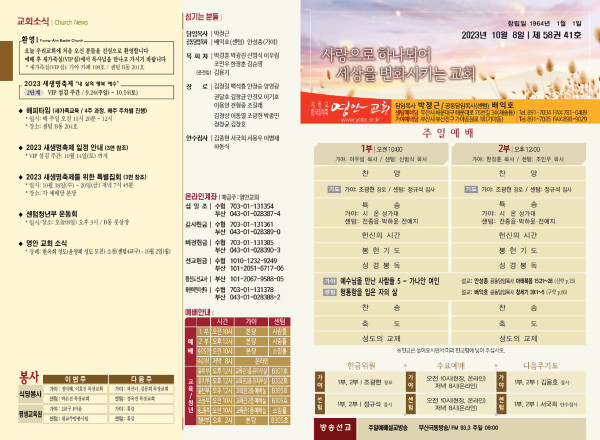 2023년 10월 8일 주보 (센텀예배당) 페이지 정보 작성자 관리지기 작성일23-10-07 10:53 조회3,230회 댓글0건 관련링크 목록 본문 2023년 10월 8일 주보 (센텀예배당) 댓글목록 등록된 댓글이 없습니다. 목록