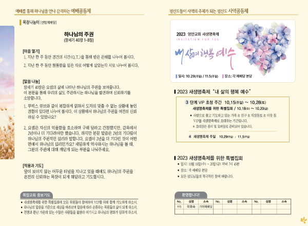 2023년 10월 15일 주보 (센텀예배당) 페이지 정보 작성자 관리지기 작성일23-10-14 11:03 조회3,373회 댓글0건 관련링크 목록 본문 2023년 10월 15일 주보 (센텀예배당) 댓글목록 등록된 댓글이 없습니다. 목록