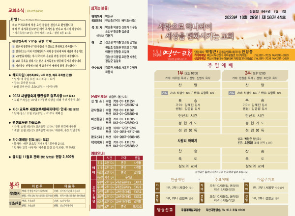 2023년 10월 29일 주보 (가야예배당) 페이지 정보 작성자 관리지기 작성일23-10-28 11:59 조회3,603회 댓글0건 관련링크 목록 본문 * 2023년 10월 29일 주보 (가야예배당) 댓글목록 등록된 댓글이 없습니다. 목록