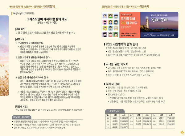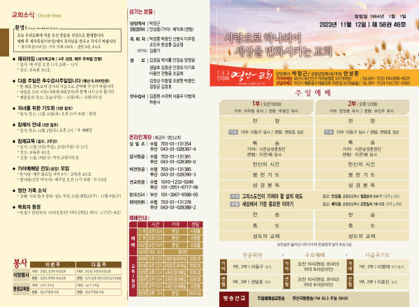 2023년 11월 12일 주보 (가야예배당) 페이지 정보 작성자 관리지기 작성일23-11-11 11:14 조회3,230회 댓글0건 관련링크 목록 본문 * 2023년 11월 12일 주보 (가야예배당) 댓글목록 등록된 댓글이 없습니다. 목록