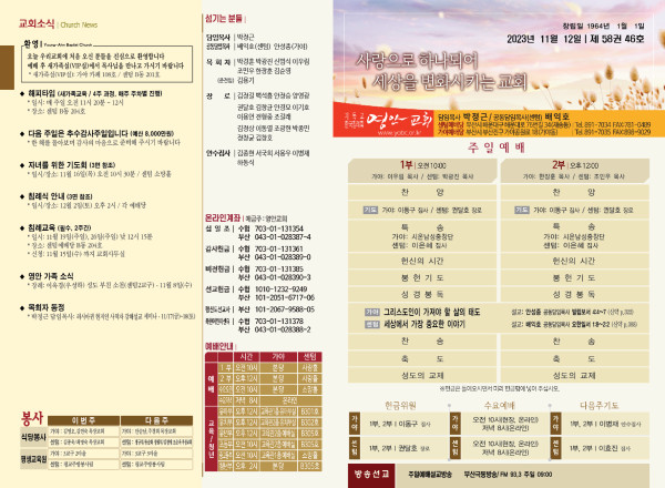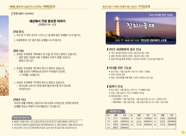 2023년 11월 12일 주보 (센텀예배당) 페이지 정보 작성자 관리지기 작성일23-11-11 11:17 조회3,365회 댓글0건 관련링크 목록 본문 * 2023년 11월 12일 주보 (센텀예배당) 댓글목록 등록된 댓글이 없습니다. 목록