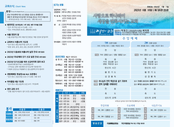 2023년 6월 18일 주보 (센텀예배당) 페이지 정보 작성자 관리지기 작성일23-06-17 11:06 조회3,508회 댓글0건 관련링크 목록 본문 2023년 6월 18일 주보 (센텀예배당) 댓글목록 등록된 댓글이 없습니다. 목록