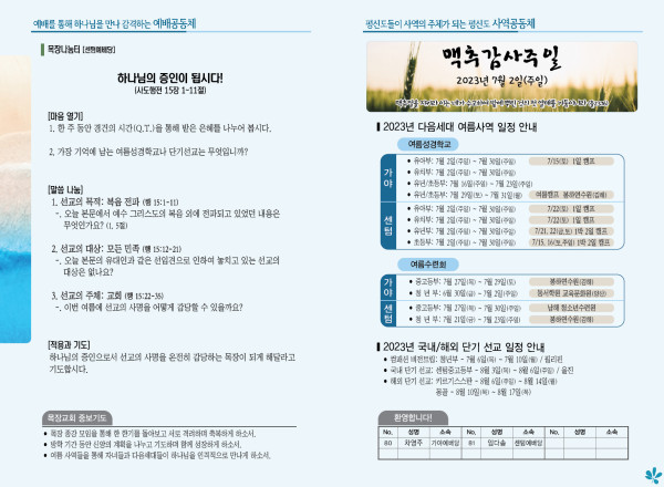 2023년 6월 25일 주보 (센텀예배당) 페이지 정보 작성자 관리지기 작성일23-06-24 10:22 조회3,495회 댓글0건 관련링크 목록 본문 2023년 6월 25일 주보 (센텀예배당) 댓글목록 등록된 댓글이 없습니다. 목록