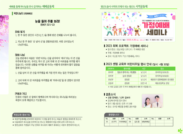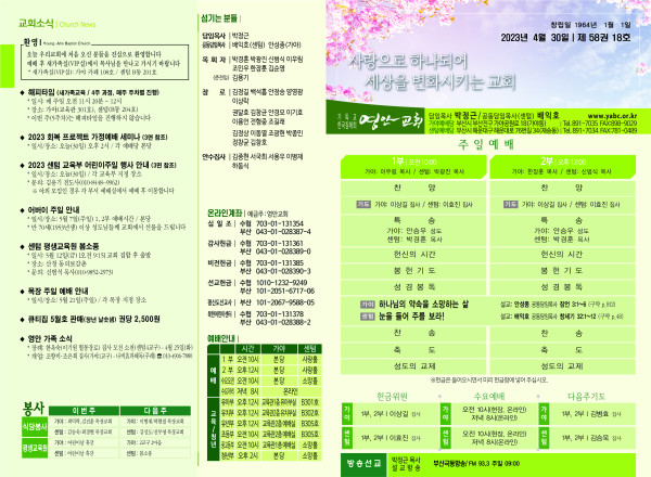 2023년 4월 30일 주보 (센텀예배당) 페이지 정보 작성자 관리지기 작성일23-04-29 11:15 조회3,805회 댓글0건 관련링크 목록 본문 * 2023년 4월 30일 주보 (센텀예배당) 댓글목록 등록된 댓글이 없습니다. 목록