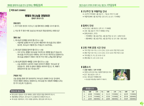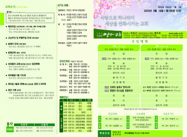 2023년 3월 19일 주보 (센텀예배당) 페이지 정보 작성자 관리지기 작성일23-03-18 11:11 조회3,694회 댓글0건 관련링크 목록 본문 2023년 3월 19일 주보 (센텀예배당) 댓글목록 등록된 댓글이 없습니다. 목록