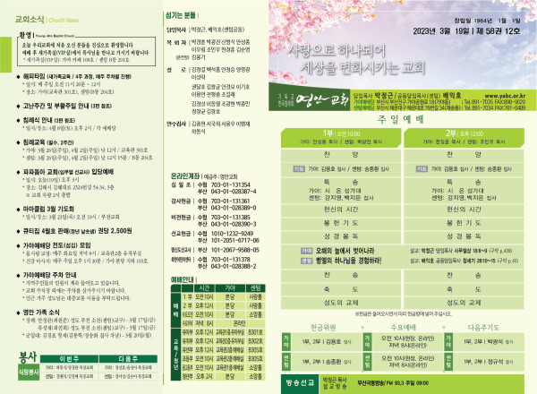 2023년 3월 19일 주보 (가야예배당) 페이지 정보 작성자 관리지기 작성일23-03-18 11:27 조회3,979회 댓글0건 관련링크 목록 본문 *2023년 3월 19일 주보 (가야예배당) 댓글목록 등록된 댓글이 없습니다. 목록