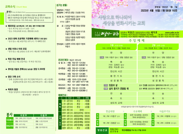 2023년 4월 16일 주보 (센텀예배당) 페이지 정보 작성자 관리지기 작성일23-04-15 11:17 조회3,692회 댓글0건 관련링크 목록 본문 2023년 4월 16일 주보 (센텀예배당) 댓글목록 등록된 댓글이 없습니다. 목록