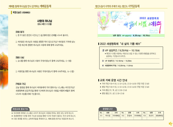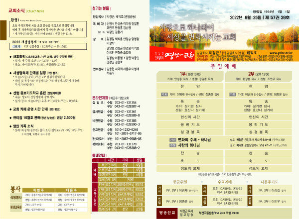 2022년 9월 25일 주보 (센텀예배당) 페이지 정보 작성자 관리지기 작성일22-09-24 11:37 조회4,195회 댓글0건 관련링크 목록 본문 2022년 9월 25일 주보 (센텀예배당) 댓글목록 등록된 댓글이 없습니다. 목록