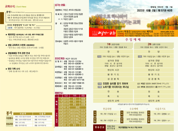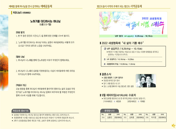 2022년 10월 2일 주보 (센텀예배당) 페이지 정보 작성자 관리지기 작성일22-10-01 11:14 조회4,224회 댓글0건 관련링크 목록 본문 2022년 10월 2일 주보 (센텀예배당) 댓글목록 등록된 댓글이 없습니다. 목록