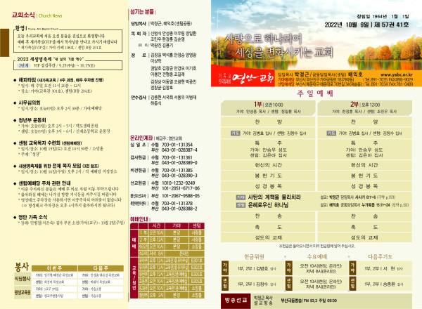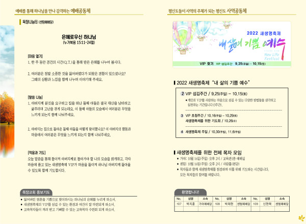 2022년 10월 9일 주보 (센텀예배당) 페이지 정보 작성자 관리지기 작성일22-10-08 11:46 조회4,152회 댓글0건 관련링크 목록 본문 2022년 10월 9일 주보 (센텀예배당) 댓글목록 등록된 댓글이 없습니다. 목록