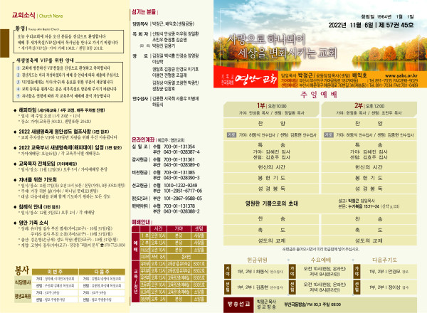 2022년 11월 6일 주보 페이지 정보 작성자 관리지기 작성일22-11-05 11:14 조회4,416회 댓글0건 관련링크 목록 본문 * 2022년 11월 6일 주보 댓글목록 등록된 댓글이 없습니다. 목록