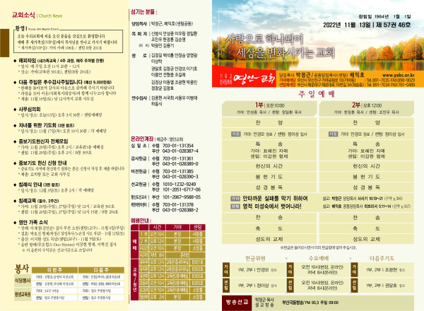2022년 11월 13일 주보 페이지 정보 작성자 관리지기 작성일22-11-12 13:03 조회4,460회 댓글0건 관련링크 목록 본문 * 2022년 11월 13일 주보 댓글목록 등록된 댓글이 없습니다. 목록