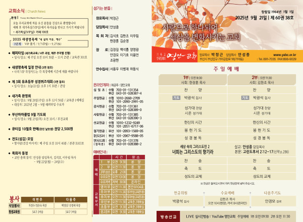 2025년 9월 21일 주보 페이지 정보 작성자 관리지기 작성일25-09-20 10:36 조회1,249회 댓글0건 관련링크 목록 본문 2025년 9월 21일 주보 댓글목록 등록된 댓글이 없습니다. 목록