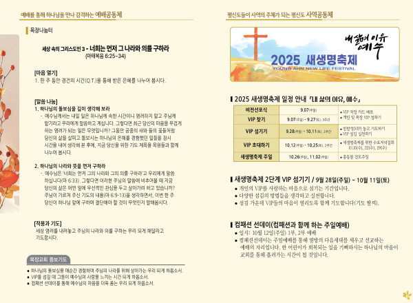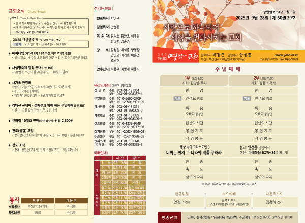 2025년 9월 28일 주보 페이지 정보 작성자 관리지기 작성일25-09-27 10:23 조회1,149회 댓글0건 관련링크 목록 본문 2025년 9월 28일 주보 댓글목록 등록된 댓글이 없습니다. 목록