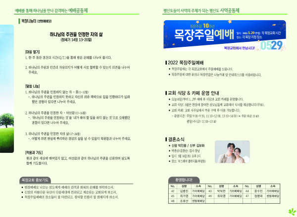 2022년 5월 8일 주보 (센텀예배당) 페이지 정보 작성자 관리지기 작성일22-05-07 11:50 조회5,072회 댓글0건 관련링크 목록 본문 2022년 5월 8일 주보 (센텀예배당) 댓글목록 등록된 댓글이 없습니다. 목록