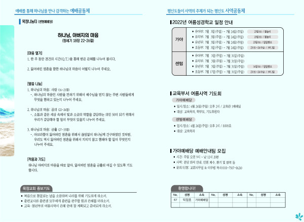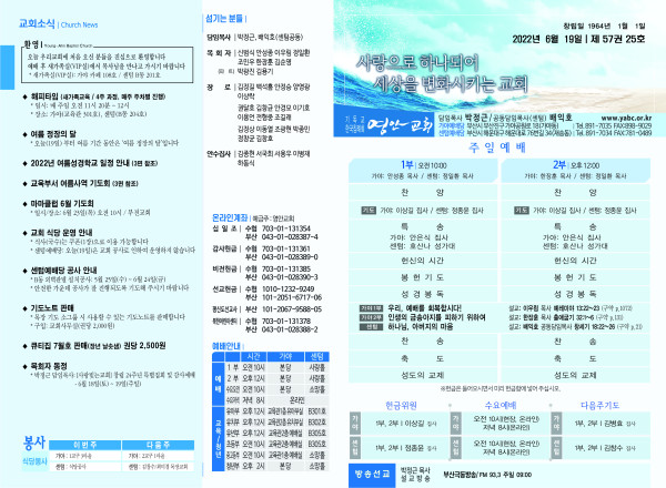 2022년 6월 19일 주보 (센텀예배당) 페이지 정보 작성자 관리지기 작성일22-06-18 11:33 조회4,618회 댓글0건 관련링크 목록 본문 2022년 6월 19일 주보 (센텀예배당) 댓글목록 등록된 댓글이 없습니다. 목록