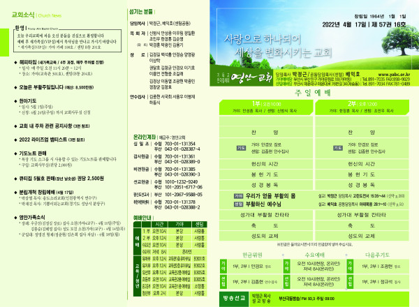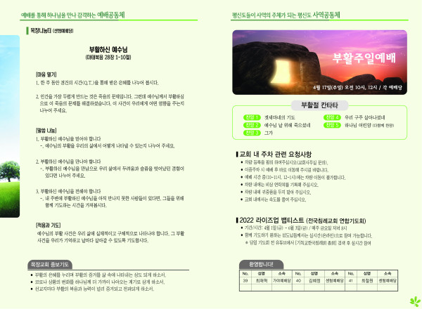 2022년 4월 17일 주보 (센텀예배당) 페이지 정보 작성자 관리지기 작성일22-04-16 11:42 조회5,021회 댓글0건 관련링크 목록 본문 2022년 4월 17일 주보 (센텀예배당) 댓글목록 등록된 댓글이 없습니다. 목록