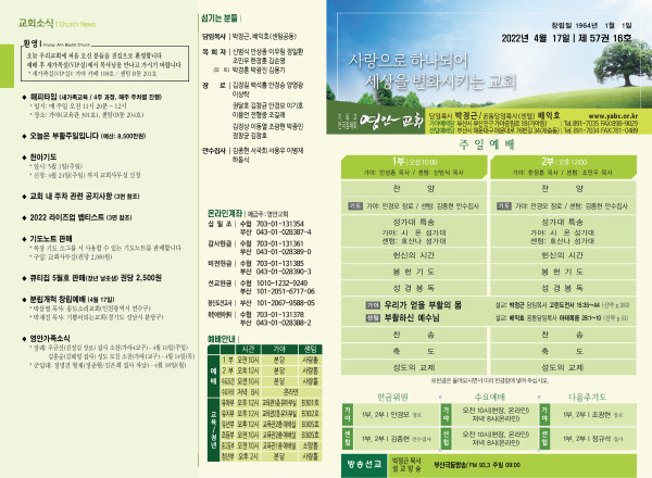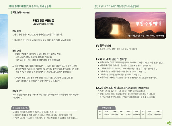 2022년 4월 17일 주보 (가야예배당) 페이지 정보 작성자 관리지기 작성일22-04-16 11:52 조회5,114회 댓글0건 관련링크 목록 본문 *2022년 4월 17일 주보 (가야예배당) 댓글목록 등록된 댓글이 없습니다. 목록