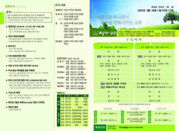 2022년 4월 24일 주보 (센텀예배당) 페이지 정보 작성자 관리지기 작성일22-04-23 11:44 조회4,717회 댓글0건 관련링크 목록 본문 2022년 4월 24일 주보 (센텀예배당) 댓글목록 등록된 댓글이 없습니다. 목록