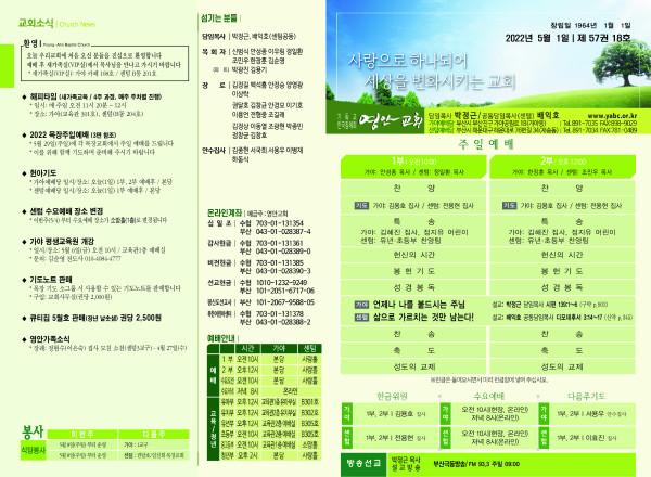 2022년 5월 1일 주보 (가야예배당) 페이지 정보 작성자 관리지기 작성일22-04-30 11:06 조회4,996회 댓글0건 관련링크 목록 본문 2022년 5월 1일 주보 (가야예배당) 댓글목록 등록된 댓글이 없습니다. 목록