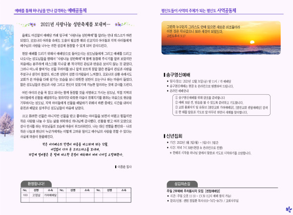 2021년 12월 26일 주보 페이지 정보 작성자 관리지기 작성일21-12-24 14:08 조회5,863회 댓글0건 관련링크 목록 본문 2021년 12월 26일 주보 댓글목록 등록된 댓글이 없습니다. 목록