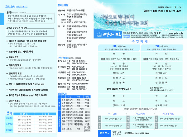 2021년 6월 20일 주보 페이지 정보 작성자 관리지기 작성일21-06-19 11:04 조회6,338회 댓글0건 관련링크 목록 본문 *2021년 6월 20일 주보 댓글목록 등록된 댓글이 없습니다. 목록