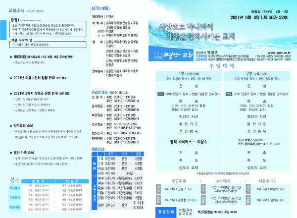 2021년 8월 8일 주보 페이지 정보 작성자 관리지기 작성일21-08-07 12:05 조회6,096회 댓글0건 관련링크 목록 본문 * 2021년 8월 8일 주보 댓글목록 등록된 댓글이 없습니다. 목록