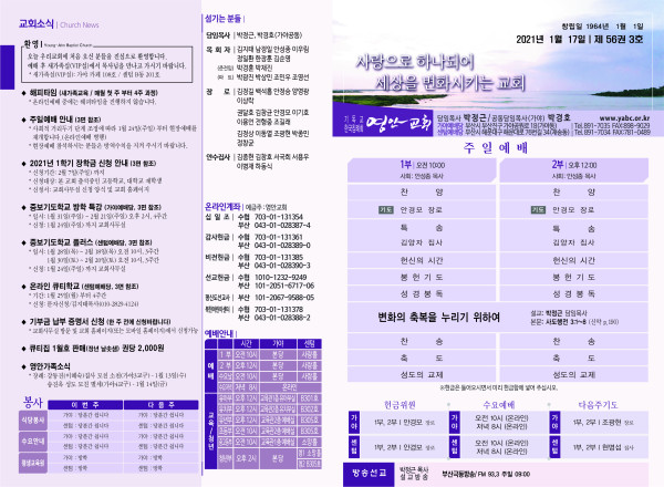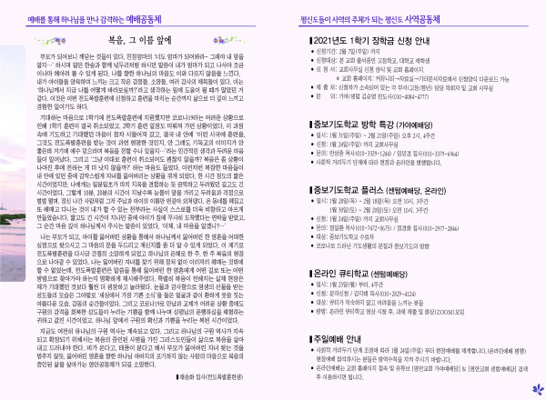 2021년 1월 17일 주보 페이지 정보 작성자 관리지기 작성일21-01-16 11:59 조회6,847회 댓글0건 관련링크 목록 본문 2021년 1월 17일 주보 댓글목록 등록된 댓글이 없습니다. 목록