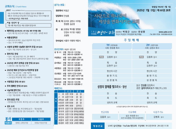 2025년 7월 13일 주보 페이지 정보 작성자 관리지기 작성일25-07-12 11:13 조회1,624회 댓글0건 관련링크 목록 본문 2025년 7월 13일 주보 댓글목록 등록된 댓글이 없습니다. 목록