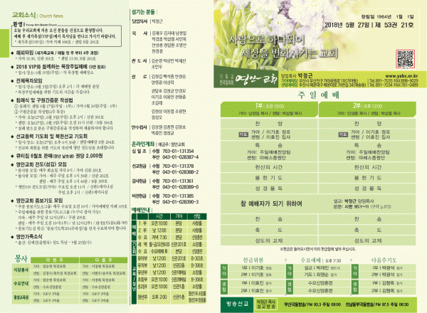 2018년 5월 27일 주보 페이지 정보 작성자 관리지기 작성일18-05-26 14:21 조회12,159회 댓글0건 관련링크 목록 본문 [2018년 5월 27일 주보] 댓글목록 등록된 댓글이 없습니다. 목록