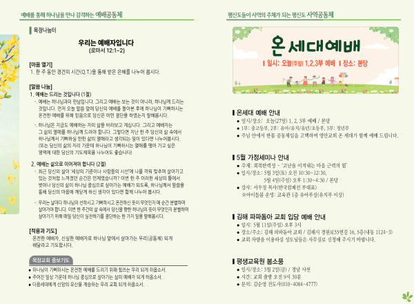 2025년 4월 27일 주보 페이지 정보 작성자 관리지기 작성일25-04-26 10:49 조회1,915회 댓글0건 관련링크 목록 본문 2025년 4월 27일 주보 댓글목록 등록된 댓글이 없습니다. 목록