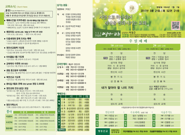 2017년 5월 21일 주보 페이지 정보 작성자 관리지기 작성일17-05-20 12:11 조회15,132회 댓글0건 관련링크 목록 본문 2017년 5월 21일 주보 댓글목록 등록된 댓글이 없습니다. 목록