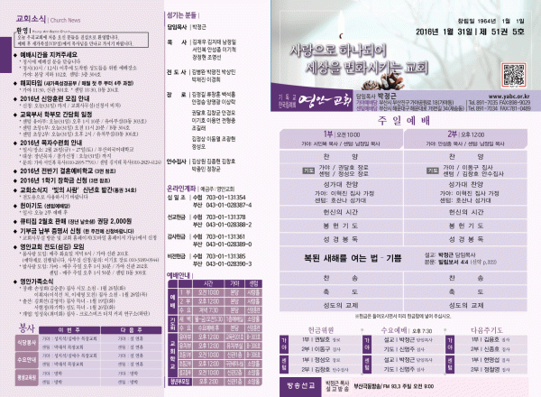 2016년 1월 31일 주보 페이지 정보 작성자 영안교회 작성일16-01-30 12:33 조회12,361회 댓글0건 관련링크 목록 본문 2016년 1월 31일 주보 댓글목록 등록된 댓글이 없습니다. 목록