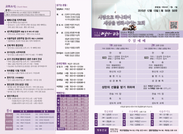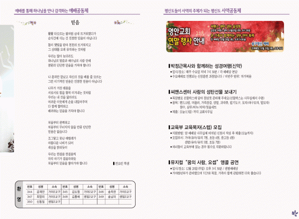 2015년 12월 13일 주보 페이지 정보 작성자 영안교회 작성일15-12-12 14:20 조회10,947회 댓글0건 관련링크 목록 본문 2015년 12월 13일 주보 댓글목록 등록된 댓글이 없습니다. 목록