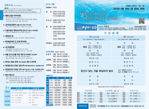 2015년 6월 28일 주보 페이지 정보 작성자 yabc 작성일15-06-27 00:00 조회10,349회 댓글0건 관련링크 목록 본문 2015년 6월 28일 주보 댓글목록 등록된 댓글이 없습니다. 목록