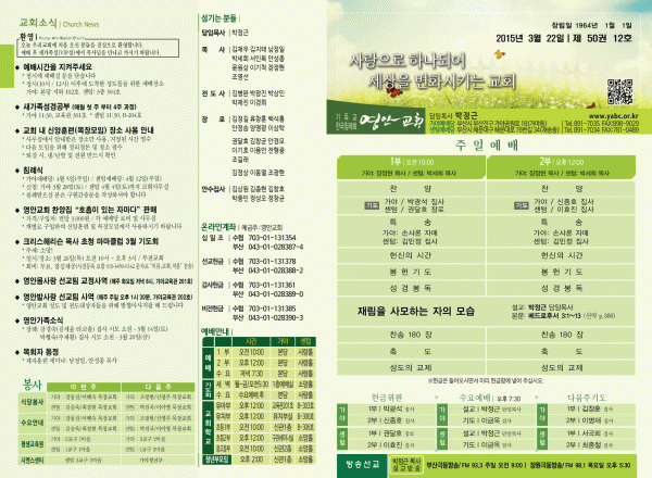 2015년 3월 22일 주보 페이지 정보 작성자 yabc 작성일15-03-21 00:00 조회10,050회 댓글0건 관련링크 목록 본문 2015년 3월 22일 주보 댓글목록 등록된 댓글이 없습니다. 목록