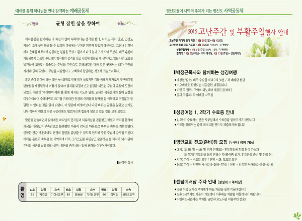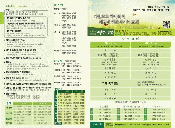 2015년 3월 29일 주보 페이지 정보 작성자 yabc 작성일15-03-28 00:00 조회10,300회 댓글0건 관련링크 목록 본문 2015년 3월 29일 주보 댓글목록 등록된 댓글이 없습니다. 목록